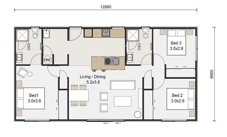 The ‘FC85’ house plan shown here, offers you three double sized bedrooms, an ensuite, a separate bathroom, separate laundry with a central open plan kitchen, dining, and lounge area. The plans have the house positioned facing north to make the most of the sunlight as well as to capture the views of the Coromandel Forest Park - with a deck out the front, these views can be enjoyed at an affordable price. With a modern Monopitch Roof, what’s not to like!
