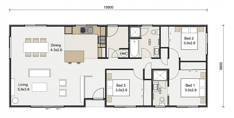 The package shown here, is based on our popular FC105 Mono plan, configured to include the Kitchen C layout. It offers a master bedroom with ensuite, 2 additional bedrooms, family bathroom, separate laundry and open plan kitchen/dining/lounge.