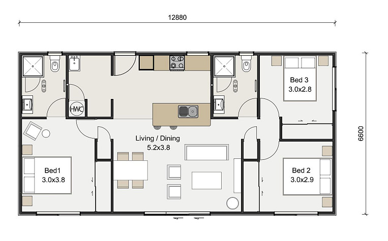The package shown here, is based on our popular FC85 plan and offers a master bedroom with ensuite, 2 additional bedrooms, family bathroom, separate laundry and open plan kitchen/dining/lounge.