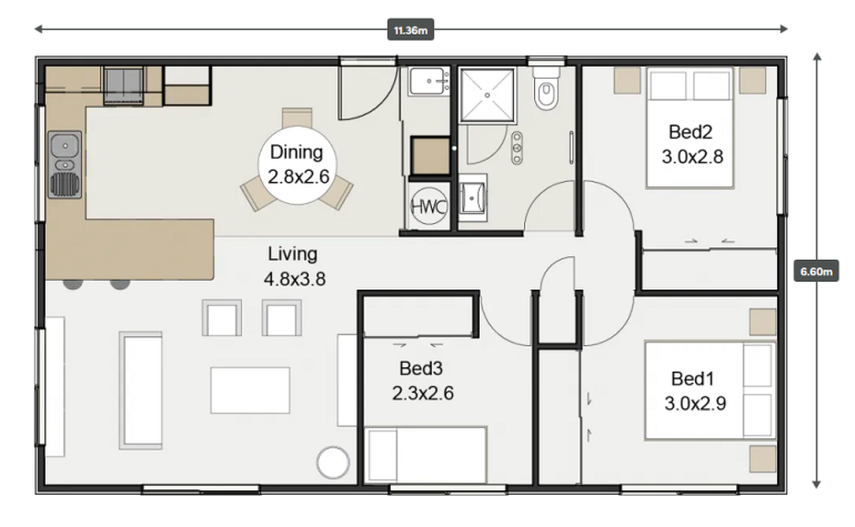 The ‘FC75’ package shown here, offers you 3 good sized bedrooms, 1 bathroom, with open plan kitchen, dining, and lounge.