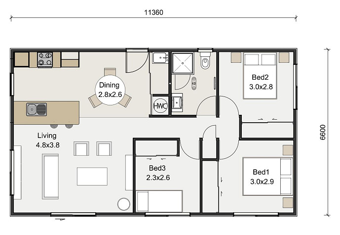 The “FC75 std gable option’ package shown here, offers you an affordable design with 3 good sized bedrooms, family bathroom, laundry area a compact open kitchen/dining/lounge – which will effortlessly lead out to the deck off the lounge.